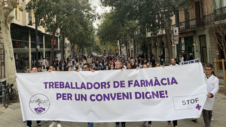Prop de 200 farmacèutics s'han manifestat aquest diumenge a Barcelona per exigir l'equiparació dels convenis catalans amb l'estatal, és a dir, que s'equiparin les condicions laborals i salarials. Segons l'Associació de Farmacèutics Adjunts i Substituts de Catalunya (AFASCAT), el personal assalariat farmacèutic de Catalunya té "amb diferència les pitjors condicions de tot l'Estat".