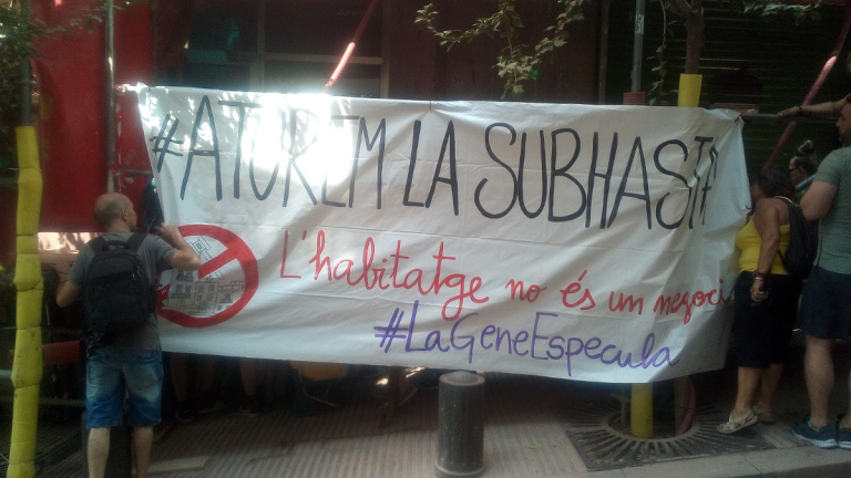 Un cinquantena de persones s'apleguen davant la porta del número 51 del carrer del Pla de Fornells, al barri de Roquetes, districte de Nou Barris. Peten la xerrada, comparteixen informació i esperen. El pis és un dels 46 immobles propietat de la Generalitat –procedents d'herències intestades– que aquesta es disposa a subhastar el proper 5 de juliol. La plataforma Aturem la Subhasta (formada per set col·lectius diferents) exigeix, amb aquesta acció, que els immobles no passin a mans privades, i es destinin a habitatge social. Bàrbara Roch, portaveu de la plataforma, assegura que en un districte com Nou Barris, "que pateix una gran emergència habitacional, és de sentit comú que si els pisos són públics, no passin a mans d'inversors privats".