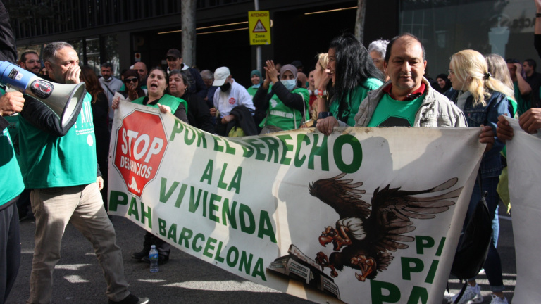 La protesta d'activistes de la PAH davant la seu del PSC contra l'enduriment de la LECrim. Gerard Artigas / ACN