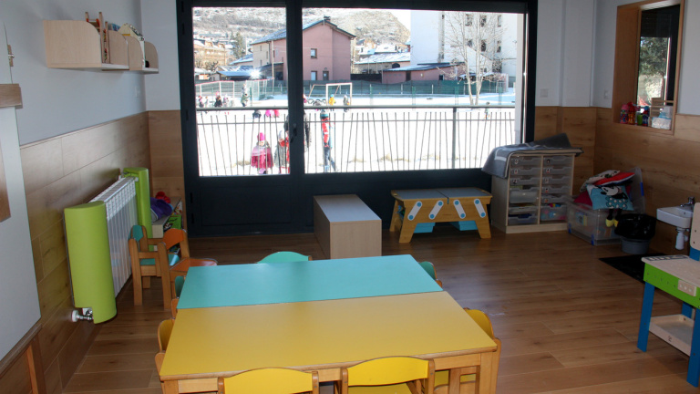 Una aula de la Llar d'infants Els Esquirolets de Llívia (Cerdanya) i on es veuen alumnes del centre i de l'Escola Jaume I al pati. Imatge de l'11 de gener de 2021. Albert Lijarcio / ACN