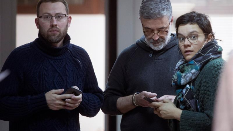 El cabeza de lista de CUP, Carles Riera (c), junto a Vidal Aragonés (i) y Natalia Sánchez (d), en la sede del partido este miércoles. EFE/Marta Pérez