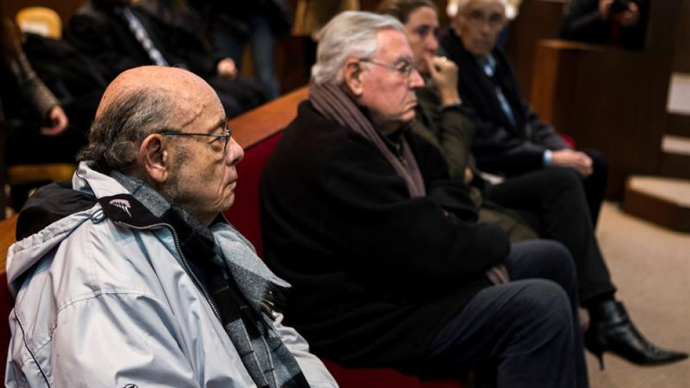Los ex responsables del Palau de la Música Fèlix Millet y Jordi Montull, principales condenados por el expolio, durante la vista celebrada hoy en la Audiencia de Barcelona. EFE/ Quique García