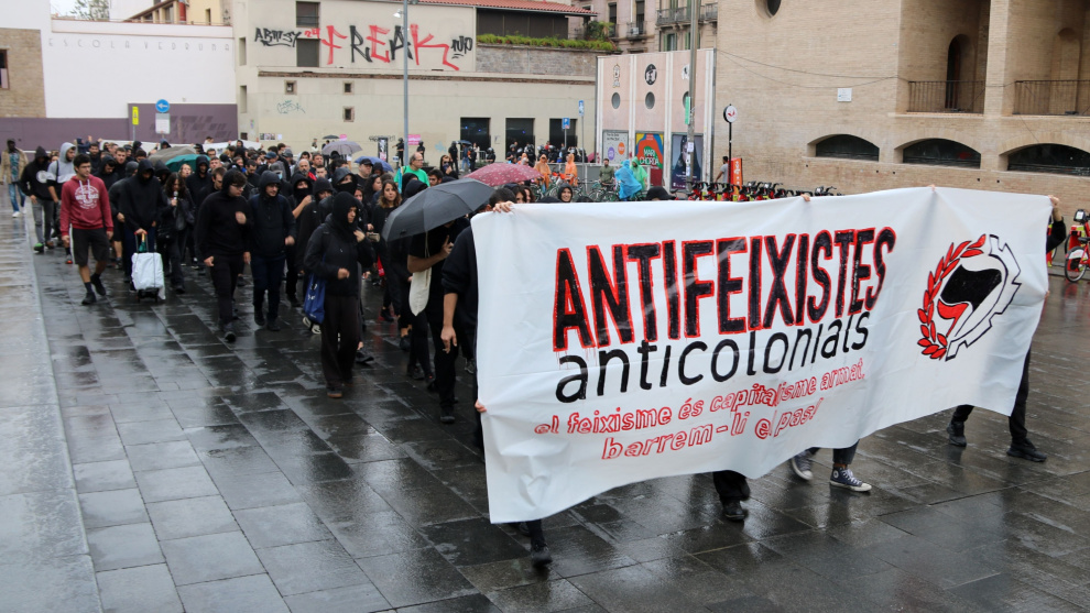 Els manifestants, vestits completament de negre, han fet un discurs davant del Centre de Serveis Socials del Raval i han pintat un grafit a la porta acusant l'equipament de ser "racista i colonialista". Els antifeixistes han insistit: "El feixisme és el capitalisme armat, aturem-lo!" i han recordat que el Dia de la Hispanitat celebra "més de 500 anys de saqueig, esclavitud, destrucció del territori i colonització".