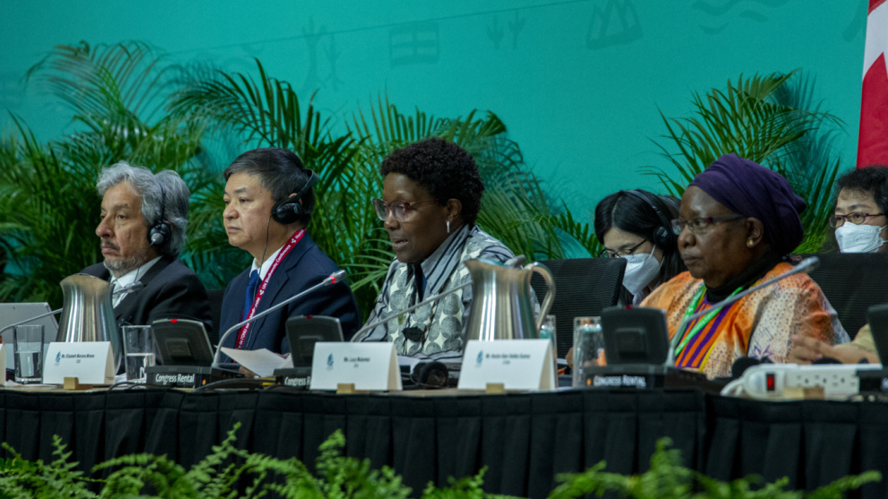 La secretaria ejecutiva de la Convención sobre Diversidad Biológica, Elizabeth Maruma Mrema; y el presidente de la Conferencia de la ONU sobre Biodiversidad COP15, el chino Huang Rinqiu, participan hoy en el cierre de la sesión ministerial en Montreal