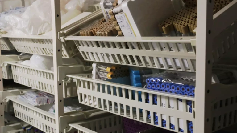 Prestatgeries per guardar el material per posar vacunes als usuaris del Servei d'Atenció al Viatger Internacional, de l'Hospital Clínic. Pol Solà / ACN