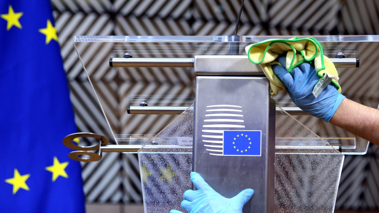 Un operario desinfecta un atril con la bandera de la UE, antes de la rueda de prensa del presidente del Consejo Eureopeo, Charles Michel. tras la primera cumbre de la UE en la se comenzaron a discutir el plan contra la crisis del coronavirus.. REUTERS/Fra