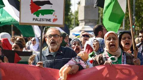 Una imatge de la manifestació en suport a Palestina a Barcelona d'aquest dissabte a la tarda. Pepe Torres / EFE