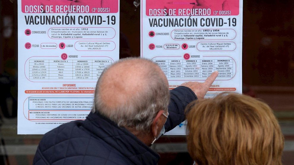 Dos personas observan un cartel con las pautas para recibir la tercera dosis de Pfizer en Valladolid este miércoles en el que el Ministerio de Sanidad ha recomendado limitar el núœmero de participantes en los "eventos púœblicos y sociales", especialm