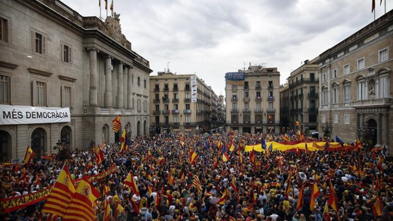 Un cop a la plaça de Sant Jaume, alguns dels participants en la manifestació han despenjat senyeres i pancartes amb la paraula democràcia i han trencat la que hi ha a la façana de l'Ajuntament amb l'expressió "més democràcia".