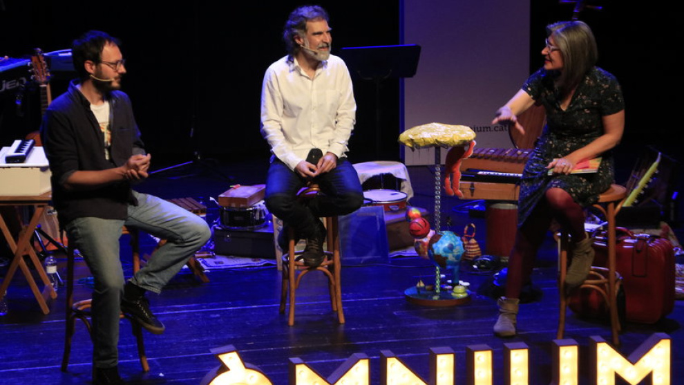 El president d’Òmnium Cultural, Jordi Cuixart, presenta amb l'il·lustrador Oriol Malet i la narradora Mon Mas el segon conte infantil que ha escrit, 'El polsim màgic', al Centre Artesà Tradicionarius de Barcelona. Laura Fíguls / ACN