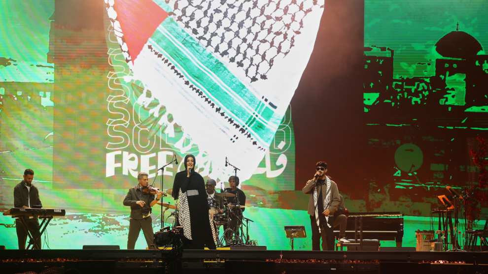 Per l'escenari del Palau Sant Jordi van passar personalitats de Catalunya i de l'Estat com Pep Guardiola, Bad Gyal o Fermin Muguruza, però també artistes internacionals i palestins. Rosalía va fer una aparició sorpresa després de la polèmica pel seu silenci davant el genocidi de Gaza