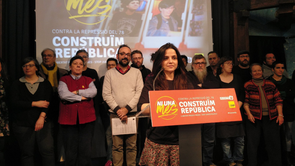 Dirigents de la CUP, amb la diputada Maria Sirvent en primer terme, en la roda de premsa d'aquest dimarts. CUP