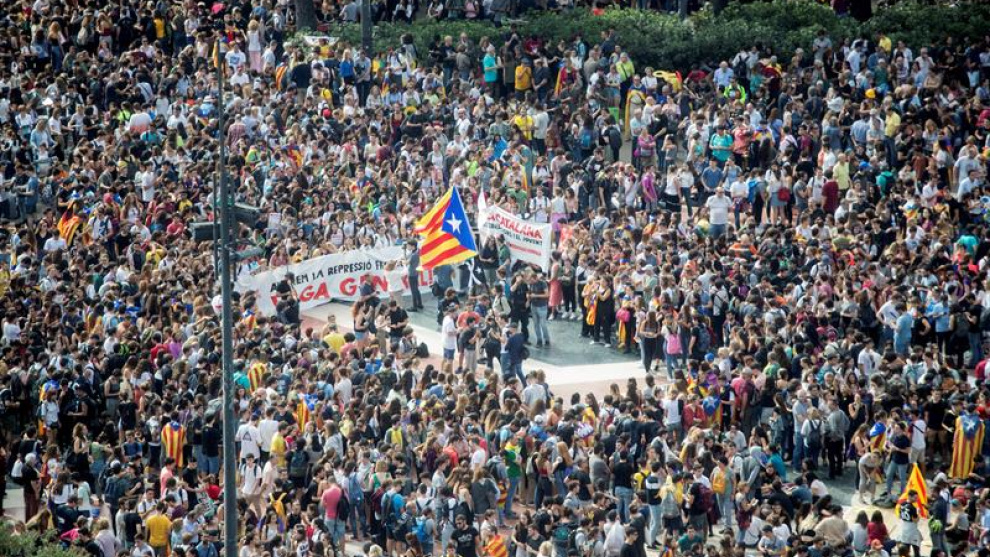 14/10/2019.- Miles de personas se concentran en la Plaza de Catalunya de Barcelona en protesta por la sentencia del procés. EFE/Marta Pérez