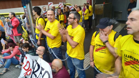 Deu activistes dels CDR s'han encadenat a les portes de l'estació d'Arc de Triomf, a Barcelona, per demanar la llibertat dels presos independentistes detinguts el passat 23 de setembre. Després de manifestar-se pel centre de la capital catalana, la mobilització ha arribat a la boca del metro i la Renfe, on 10 dels concentrats s'han lligat amb cadenes.