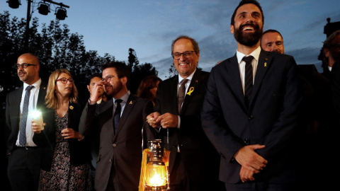 Torrent ha estat l'encarregat de recollir la flama del Canigó, donant inici a la marxa, en la qual han participat també familiars dels encausats. Mentrestant, la Guàrdia d'Honors dels Mossos d'Esquadra es preparava al Born Centre Cultural –del qual Torra en va ser director del 2012 al 2015– per a la tradicional hissada de bandera. El Cor Jove de l'Orfeó Català ha interpretat en aquest moment el Cant de la Senyera i la comitiva s'ha tornat a posar en marxa, obrint-se pas entre els turistes que encara aprofiten els primers dies de setembre, i els darrers de calor, per visitar el centre de Barcelona.