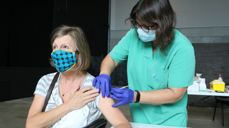 Una dona rebent la vacuna a l'Escala.