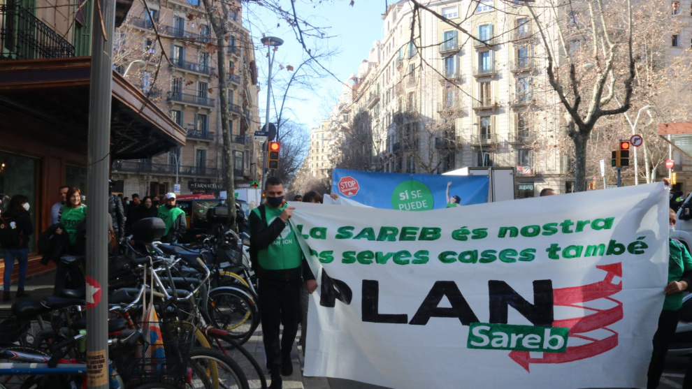 La manifestació de la PAH d'aquest dimarts per reclamar al Govern espanyol que els pisos de la Sareb passin a ser públics. Martí Rodríguez / Blanca Blay / ACN