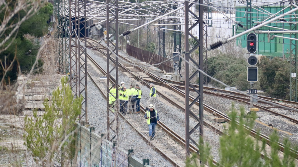 Personal tècnic treballant a la zona accés al túnel de Rubí on és previst actuar d'emergència per a restablir el pas de mercaderies.
