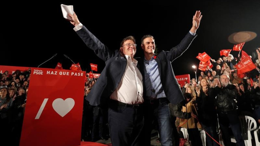 Ximo Puig i Pedro Sánchez en el miting de final de campanya a València. EFE / Juan Carlos Cárdenas