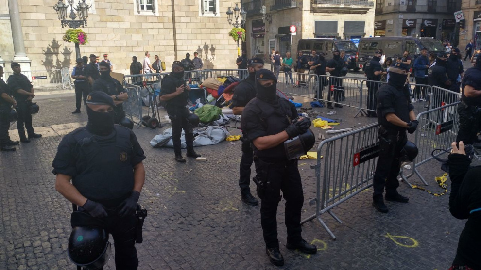 Diverses desenes d'agents i vehicles dels Mossos s'han personat a la plaça, on se situen les seus de la Generalitat i de l'Ajuntament de Barcelona, i han començat a treure les tendes i carpes instal·lades al·legant "motius de seguretat".