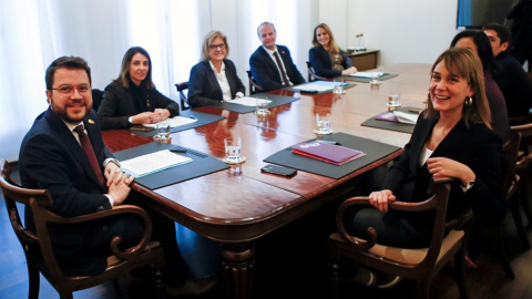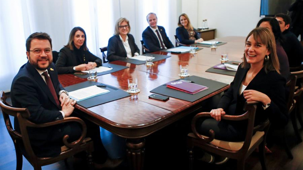 El Vicepresident i conseller de Economia, Pere Aragonès (e), i la presidenta del grup parlamentari de Catalunya En Comú Podem, Jéssica Albiach (d), durant la negociació de la reforma fiscal i els pressupostos. EFE/Quique Garcia