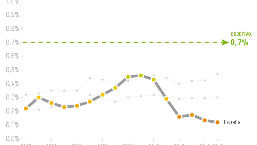 Espanya va destinar a l'ajuda al desenvolupament el 2015 tan sols 1.261 milions d'euros (tot just un 0,12% de la Renda Nacional Bruta), una tercer part del que era el 2008 (4.762 euros o un 0,46% del l'RNB ), situant-la en nivells similars als dels anys 90. Des de l'inici de la crisi aquesta política pública acumula una caiguda del 73,5%.