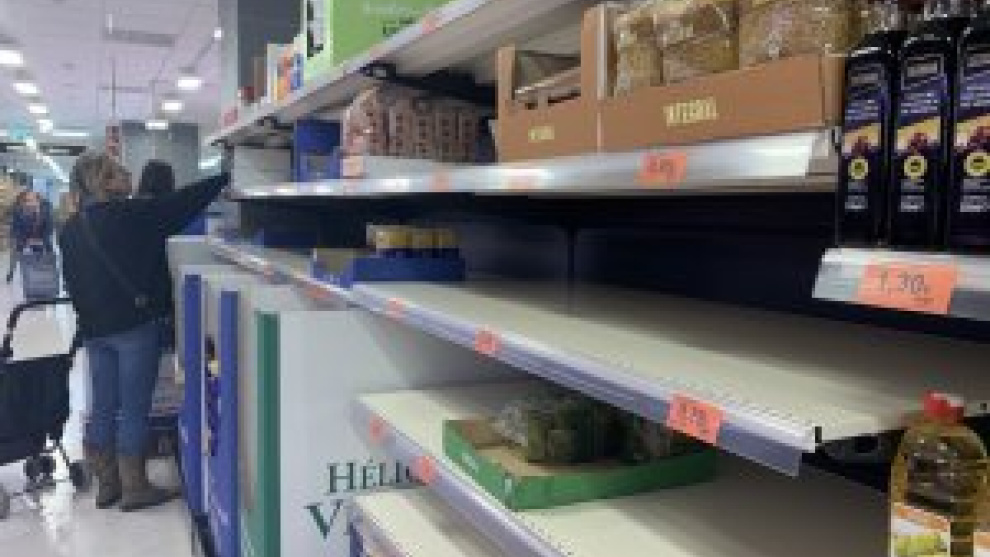 Imatge d'un supermercat de Poblenou, on alguns productes (arròs, pasta) estan gairebé exhaurits / PÚBLIC