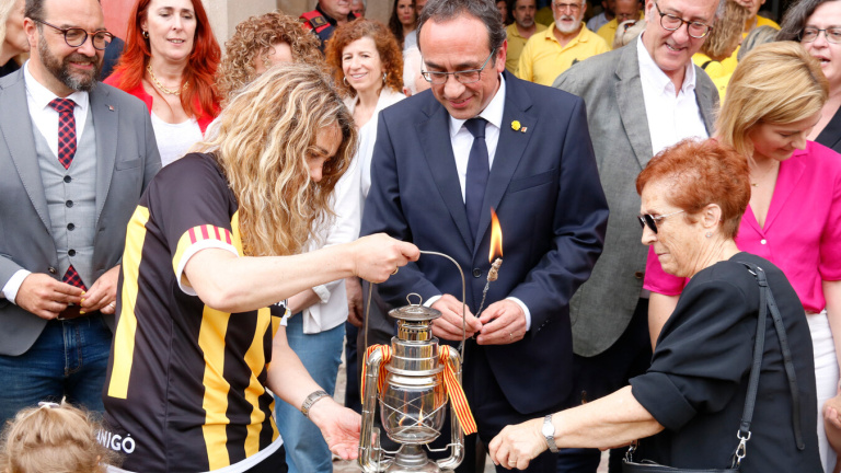 El president del Parlament, Josep Rull rep l'emblemàtic Foc Nou i avisa que "no podem romandre indiferents" davant "atacs insòlits" al català. El president d'Òmnium, Xavier Antich, fa una crida a "organitzar-se per fer front a totes les cares de l'extrema dreta"