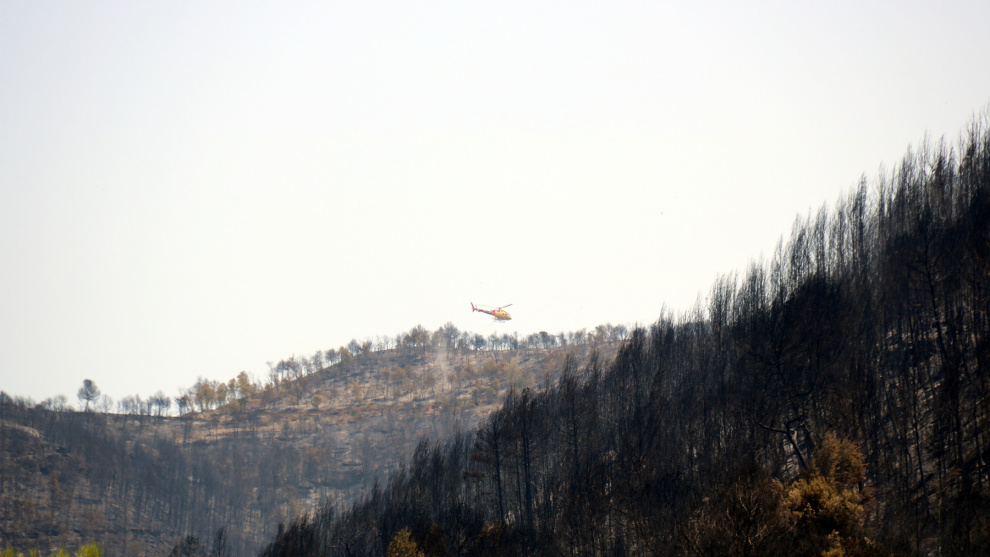 L'helicòpter remulla la zona cremada al Pont de Vilomara i Rocafort, al Bages. Nia Escolà / ACN