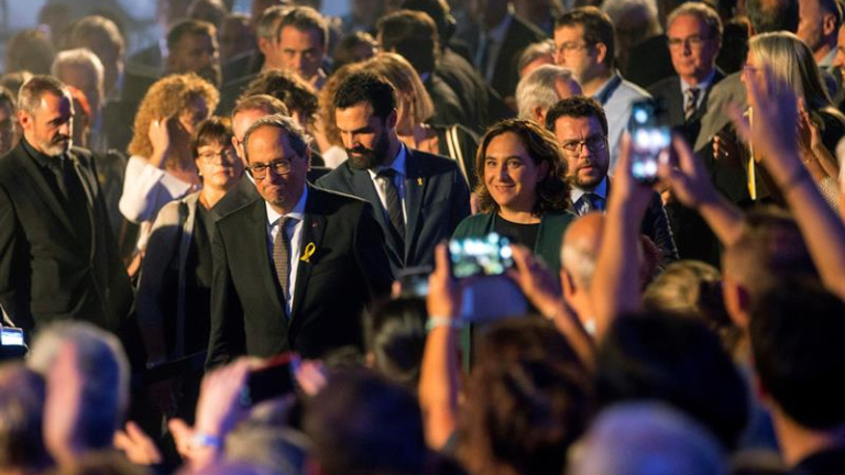El presidente de la Generalitat Quim Torra (i), junto a la alcaldesa de Barcelona, Ada Colau (d) participa en el acto institucional con motivo de la Diada en el Palau de la Generalitat. /EFE