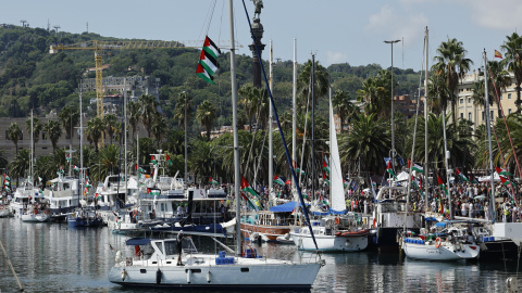 Suport massiu a Barcelona a la sortida de la Global Sumud Flotilla cap a Gaza. Banderes, pancartes, samarretes, mocadors palestins, música, ball i crits de llibertat. Unes cinc mil persones —segons la Guàrdia Urbana, en hora punta— de totes les edats han omplert el port de la capital catalana per donar suport a la missió internacional que vol trencar el "bloqueig" a Gaza i obrir un corredor humanitari per permetre l'entrada d'aigua, menjar i medicines en territori palestí.