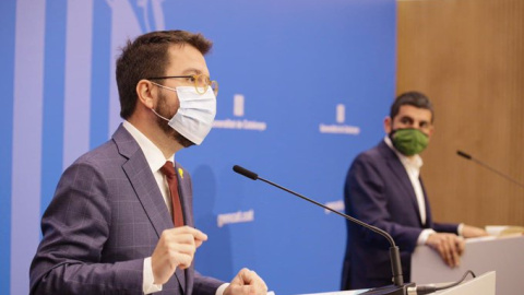 Imatge de la roda de premsa en què el vicepresident Pere Aragonès i el conseller El Homrani han informat sobre els inscrits al nou registre.