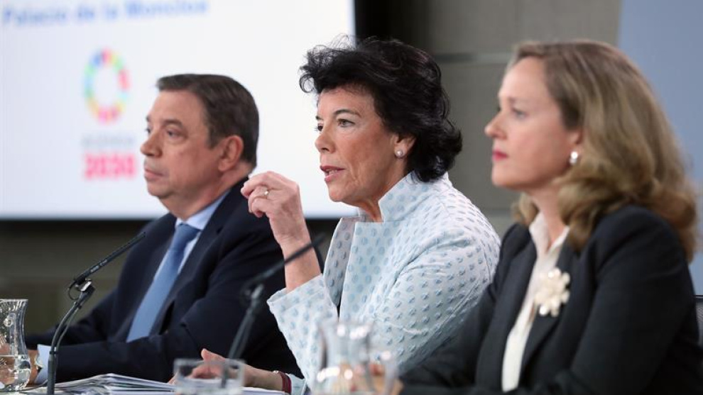 Luis Planas, Isabel Celaá y Nadia Calviño, en la rueda de prensa posterior al Consejo de Ministros / EFE