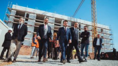 El president Pere Aragonès i Garcia i el conseller de Juli Fernàndez i Olivares visitant una promoció de pisos de lloguer social en obres a Rubí. Departament de Territori