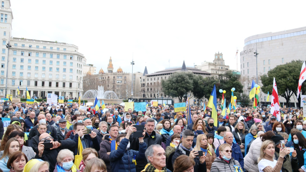 Banderes de groc i blau, cartells contra Putin i crits per la pau omplen la plaça de Catalunya