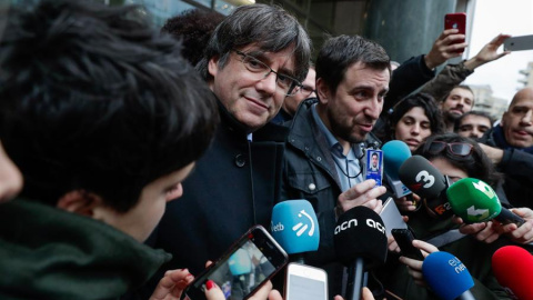 Carles Puigdemont i Antoni Comin en una roda de premsa a Bèlgica. EFE/EPA/STEPHANIE LECOCQ