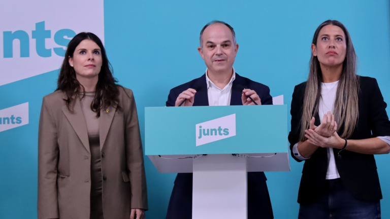 El secretari general de Junts, Jordi Turull, la portaveu del partit al Parlament, Mònica Sales, i la portaveu al Congrés, Míriam Nogueras, en roda de premsa aquest dimecres a la seu del partit. Nico Tomás / ACN