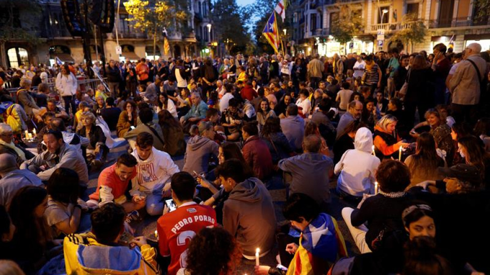 A Barcelona unes 40.000 persones s’han concentrat a l’entorn de la Delegació del Govern espanyol, situada al carrer Bruc. I diem a l’entorn perquè agents tant dels Mossos d’Esquadra com de la Policia Nacional han blindat l’edifici amb un perímetre de seguretat per impedir que els manifestants s’hi aproximessin. Abans de les set de la tarda voluntaris d’Òmnium Cultural repartien espelmes grogues a les cantonades que envolten la delegació. Rius de gent recorrien els carrers de l’Eixample que envolten l’edifici però el perímetre de seguretat controlat pels Mossos d’Esquadra i la Policia Nacional és infranquejable. “De què tenen por, que ens mengem a la Cunillera?” es preguntava la Pilar amb un deix d’indignació.