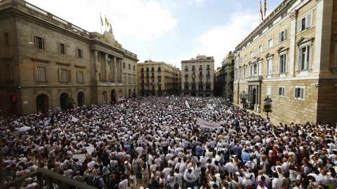 Milers de persones s'han manifestat aquest dissabte al centre de Barcelona, a la plaça de Sant Jaume, vestides amb samarretes blanques i amb el lema "parlem", per reclamar diàleg entre la Generalitat i el govern espanyol i per tal de trobar sortida al conflicte obert entre Catalunya i l'aparell de l'Estat.
