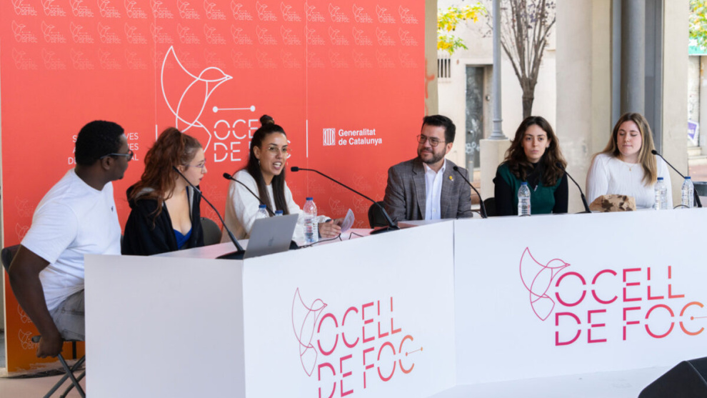 El president de la Generalitat, Pere Aragonès i Garcia, acompanyat del conseller d’Empresa i Treball, Roger Torrent i Ramió, va donar a conèixer el passat diumenge el balanç del primer any del programa ‘Ocell de Foc’ en un acte celebrat a l’antiga fàbrica del Vapor Ventalló de Terrassa. L’acte va comptar amb la presència d’entitats i joves participants en el projecte.