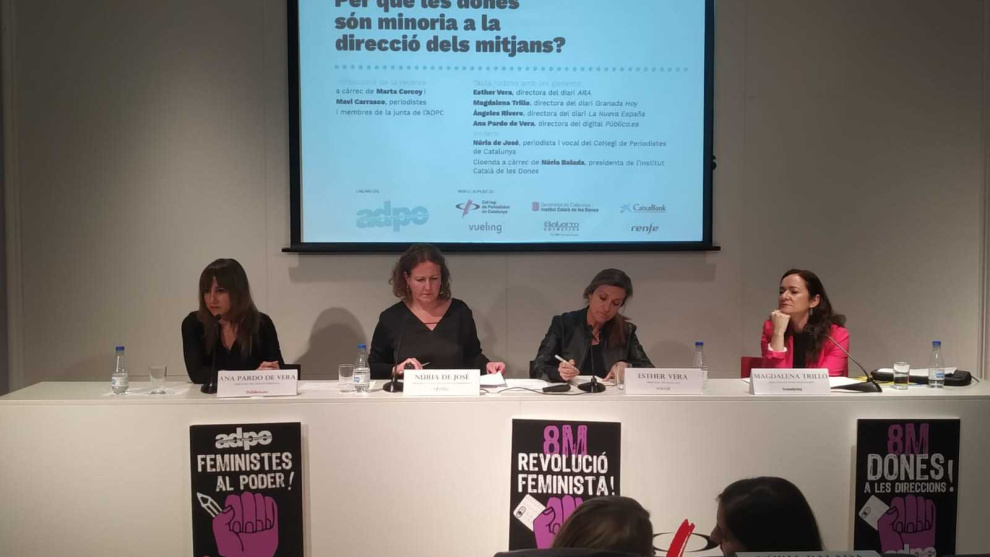 Per analitzar aquestes dades, l'ADPC ha convidat a tres direccions femenines de mitjans: "Hem hagut de sortir de Catalunya per trobar-ne tres", deia Carrasco. La taula rodona l'han compost la directora del diari Ara., Esther Vera, la directora del diari Granada Hoy, Magdalena Trillo i la directora d'aquesta casa, Ana Pardo de Vera. En el cas de Trillo, tot una rara avis tractant-se d'un diari en paper: "Els treballadors i treballadores dels mitjans digitals, en general cobrem menys. Això pot explicar per què les dones hi són més", ha apuntat Pardo.