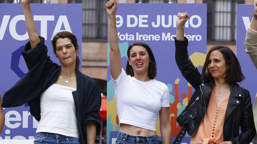 La cap de llista de Podemos a les eleccions europees, Irene Montero, la secretaria general del partit, Ione Belarra, i la número dos al Parlament Europeu, Isa Serra, en l'acte central de Podemos a Barcelona. EFE