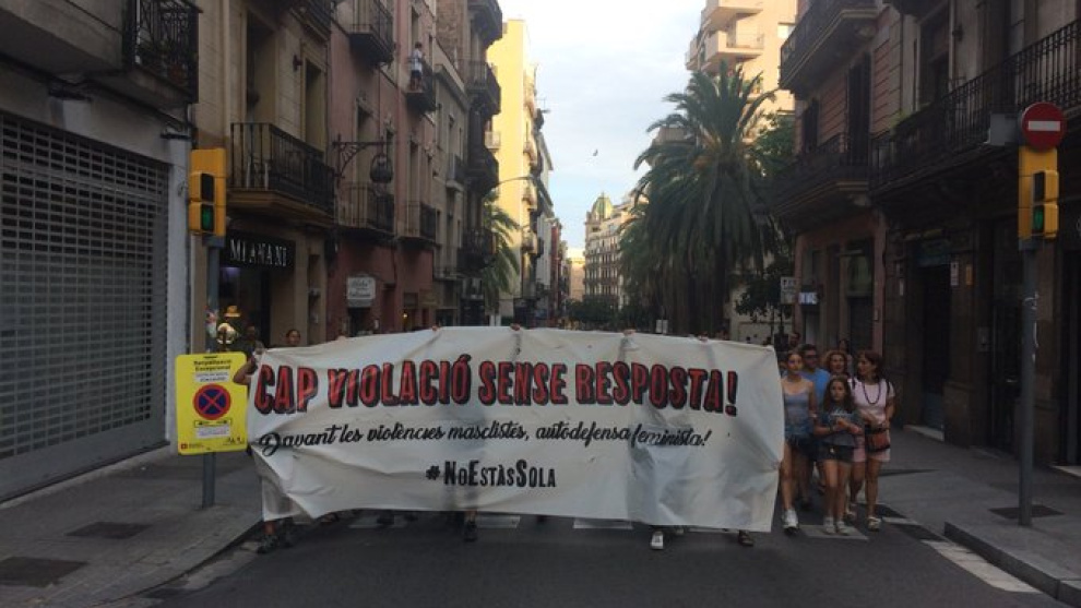 Capçalera de la manifestació al barri de Gràcia contra en rebuig a dues violacions aquest cap de setmana. @feministes_vdg