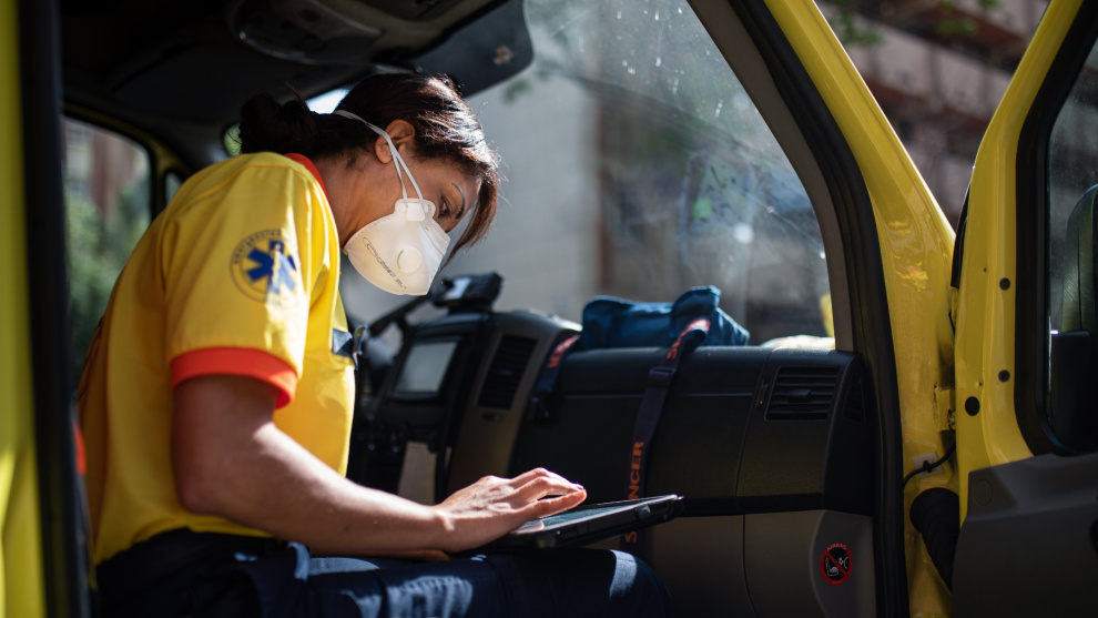 Una tècnic del Sistema d'Emergències Mèdiques (SEM) de la Generalitat de Catalunya en una ambulància durant un servei a Barcelona. Pau Venteo / Europa Press