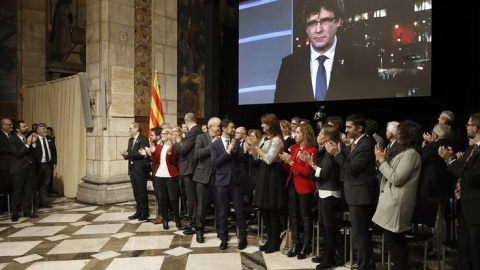 "Us hi esperem, a tots i a totes, perquè la República, o la fem entre tots o no la fem", ha finalitzat Puigdemont, seguit d'aplaudiments i crits d'independència, tant dintre com fora del Palau de la Generalitat, on s'han concentrat centenars de persones per seguir l'acte des d'una videopantalla.