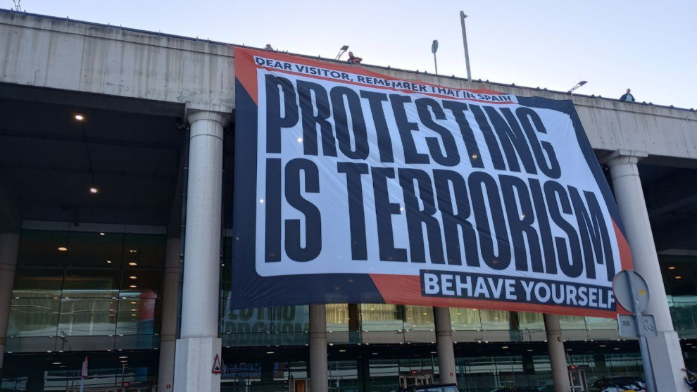 Òmnium desplega una pancarta gegant a l'aeroport del Prat: "A Espanya, protestar és terrorisme"