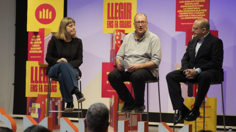 El president de l'entitat, Xavier Antich, acompanyat de Mertxe París, vicepresidenta del Gremi Llibreters, i Ignasi Sayol, president del Clúster de Logística de Catalunya, durant la presentació de la campanya 'Llegir ens fa grans'. Òmnium