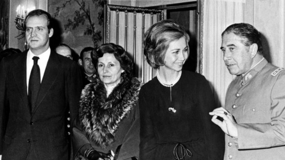 Els reis Joan Carles i Sofia amb el general Augusto Pinochet i la seva esposa durant la visita que el dictador xilè va fer a Madrid, per assistir a l'enterrament de Francisco Franco. AFP