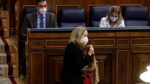 Pedro Sánchez, Nadia Calviño i Yolanda Díaz al Congrés dels Diputats durant el debat de la Llei de Pressupostos -- Juan Carlos Hidalgo / EFE