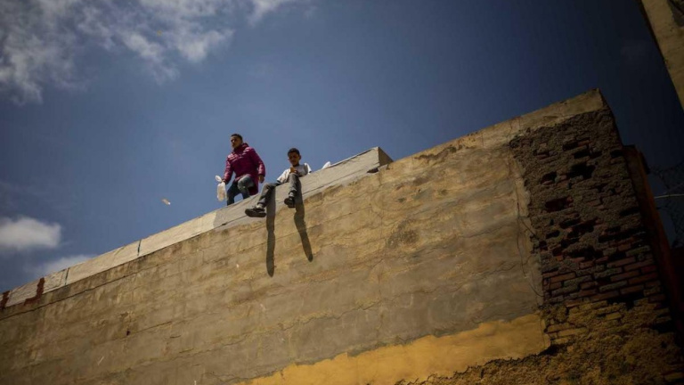 Dos nens marroquins que van entrar irregularment a Ceuta durant la crisi fronterera es mengen un entrepà mirant cap a la multitud de menors que s'amunteguen a les naus del Tarajal, d'on van escapar per la teulada després de dies de mala alimentació, falta d'espai i dormir al terra -- JAIRO VARGAS